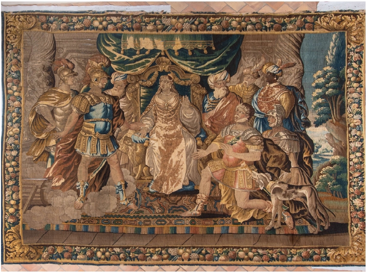 L’altro gruppo di arazzi è composto da quattro panni, datati XVI secolo, sempre di manifattura fiamminga, e racconta episodi della vita cortese: due scene di corte, una scena di battaglia e una scena con delle figure femminili in giardino.