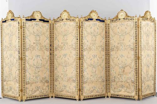 Il paravento datato 1785-1787 è opera dello scultore ligneo Giuseppe Maria Bonzanigo, dell'intagliatore Giovanni Gallinotto, la tappezzeria in seta e applicazioni a ricamo è della Manifattura regia di Torino e i vetri blu sono della Manifattura di Sèvres.