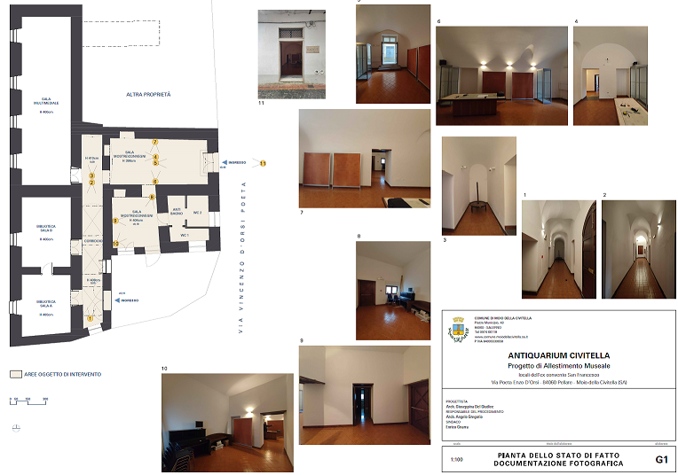 Fornitura di boiserie in magatelli di legno trattati con vernice ignifuga e pannelli in mdf sp. 16 mm.Fornitura di 49 mq di quinta realizzata con struttura interna in tubolare metallico 30x30 e pannellatura in mdf sp. 16 mm trattato superficialmente con vernice ignifuga, il vano espositivo è realizzato in pannellatura di mdf sp.16 mm trattato superficialmente con vernice ignifuga e di vetro sp. 8/9 mm extra chiaro con 9 teche. Fornitura di n 2 vetrina freestanding realizzata con struttura interna in magatelli di legno ignifuga, e struttura esterna in pannelli in mdf sp. 16 mm ignifuga e verniciati. La teca si completa con una campana di vetro sp.8/9 mm extra chiaro di dimensioni 30x40x30 h cm. Dimensioni base teca 60x60x80h cm.Fornitura di vetrina freestanding realizzata con struttura interna in magatelli di legno ignifuga e struttura esterna in pannelli in mdf sp. 16 mm La teca si completa con n.3 campane di vetro sp.8/9 mm extra chiaro di dimensioni 71x61x30 h cm, 50x60x41h cm, 50x61x30h cm.Adeguamento al nuovo allestimento dell'impianto elettrico esistente. Fornitura e posa in opera di sistema 240 V realizzato in alluminio estruso, anodizzato grigio oppure verniciato bianco opaco o nero opaco. Fornitura e posa in opera di 66 proiettori led di colore a scelta 20W, con 2 ottiche intercambiabili da 15°-38°, 4K CRI ≥90 .