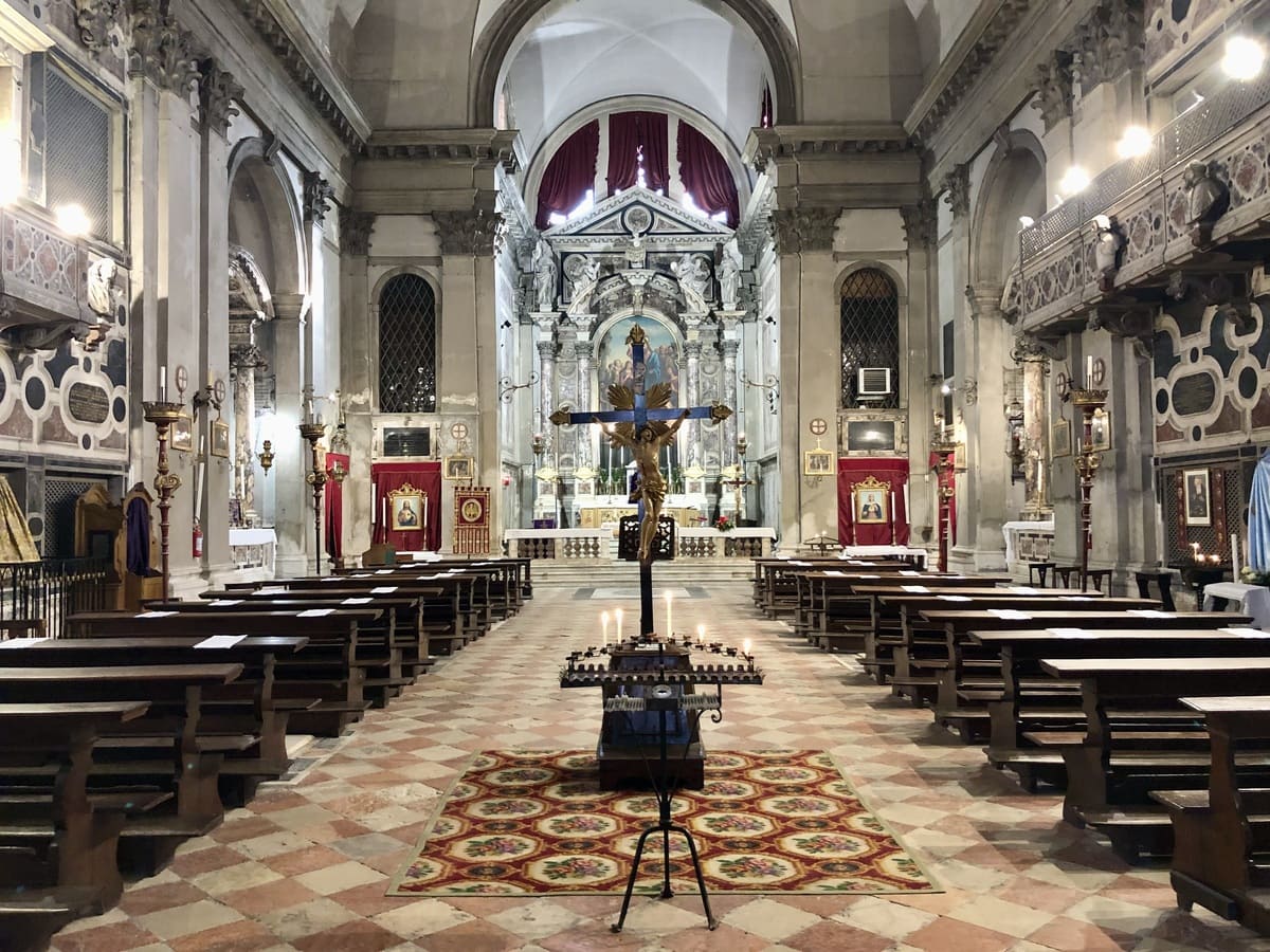 La prima parte della Chiesa venne ultimata nel 1631 e consacrata nel 1636 sotto l'invocazione di San Lazzaro, ma assunse l'aspetto definitivo solamente nel 1673, con l'innalzamento del prospetto su Rio dei Mendicanti su disegno di Giuseppe Sardi. Costruita in un solo ordine, con colonne composite che si innalzano su alti piedistalli, la chiesa accoglie sul frontone triangolare tre statue. La controfacciata del vestibolo ospita il monumento dedicato al procuratore della Dalmazia Lorenzo Dolfin con opere dello scultore Melchior Barthel.